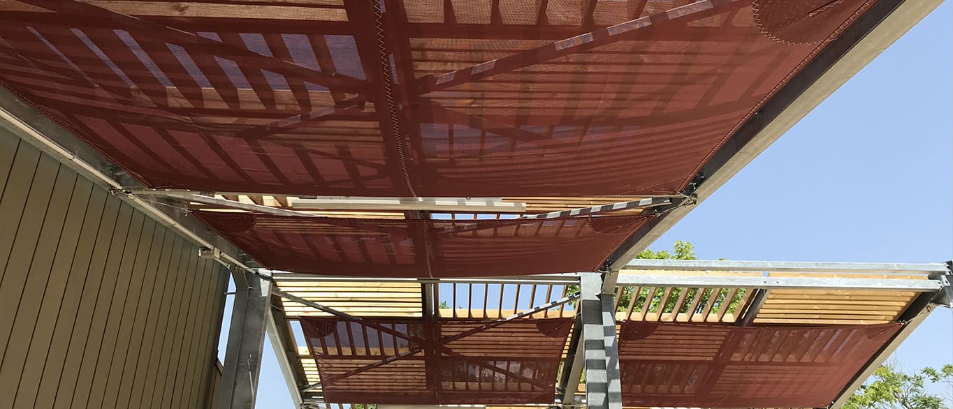 Installées pour la saison, elles offrent une protection efficace contre le soleil tout en laissant circuler l’air et la lumière grâce aux tissus techniques micro-perforés.